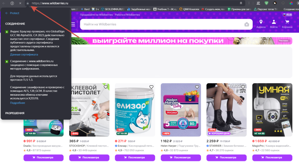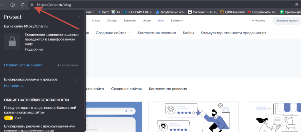 - Перед URL должен быть значок замка.