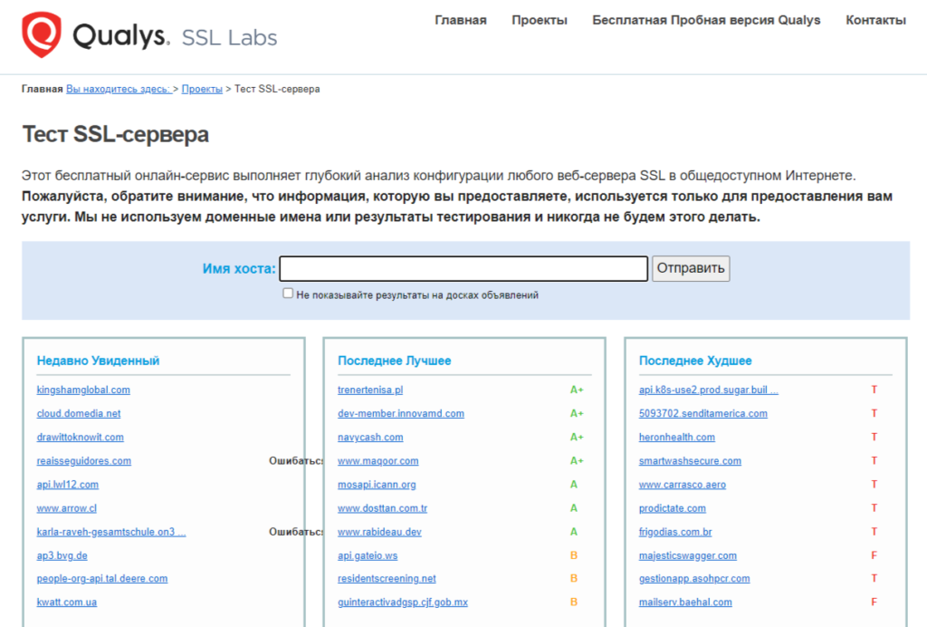 - SSL Labs. Даёт полный отчёт о состоянии SSL-сертификата. Показывает, какие протоколы и шифры используются, и подсказывает, что можно улучшить.